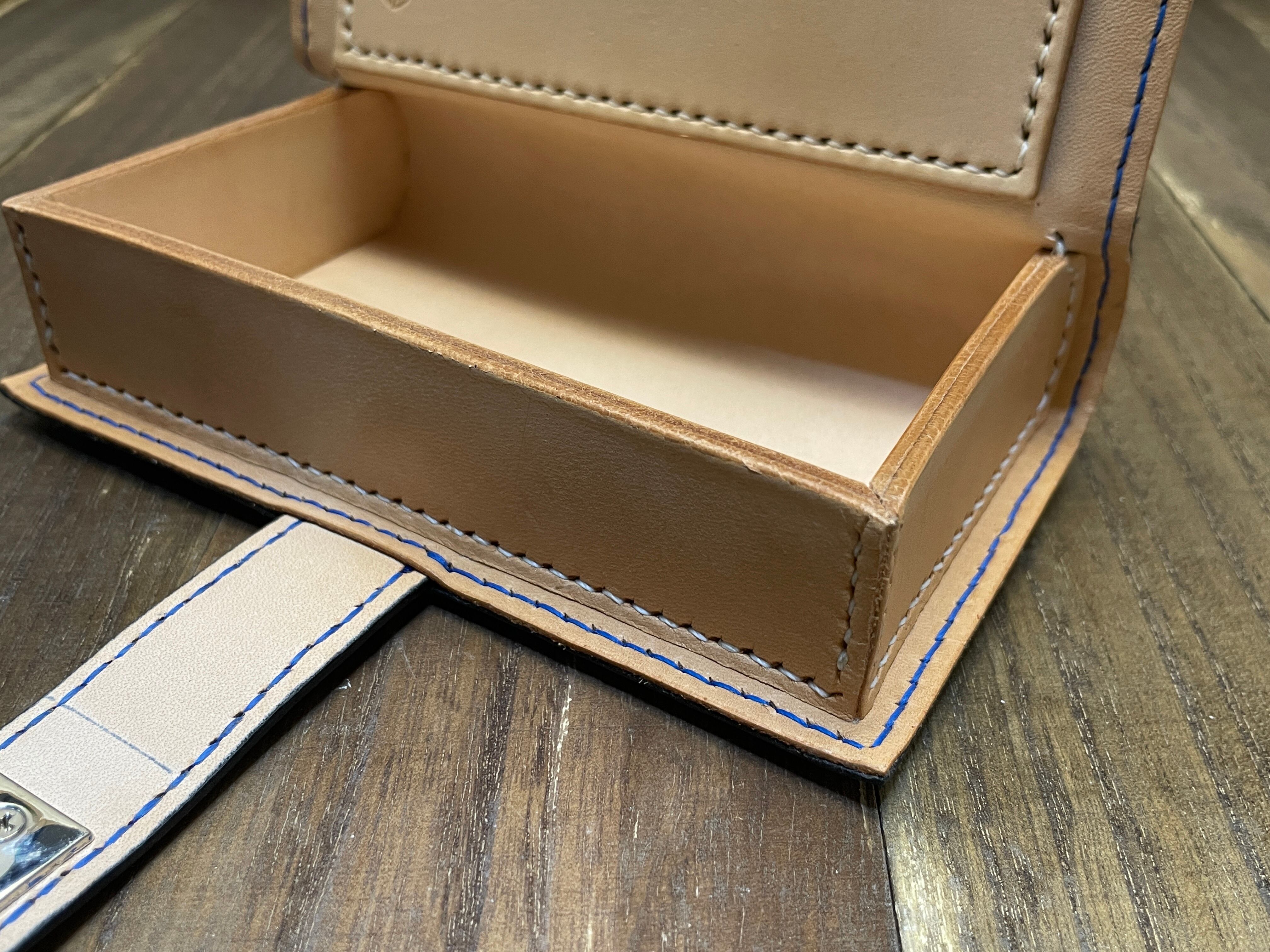 強度を増すため蓋部分は頑丈するため中に芯材を挟んであり、裏蓋部分にも2mmのヌメを使っています