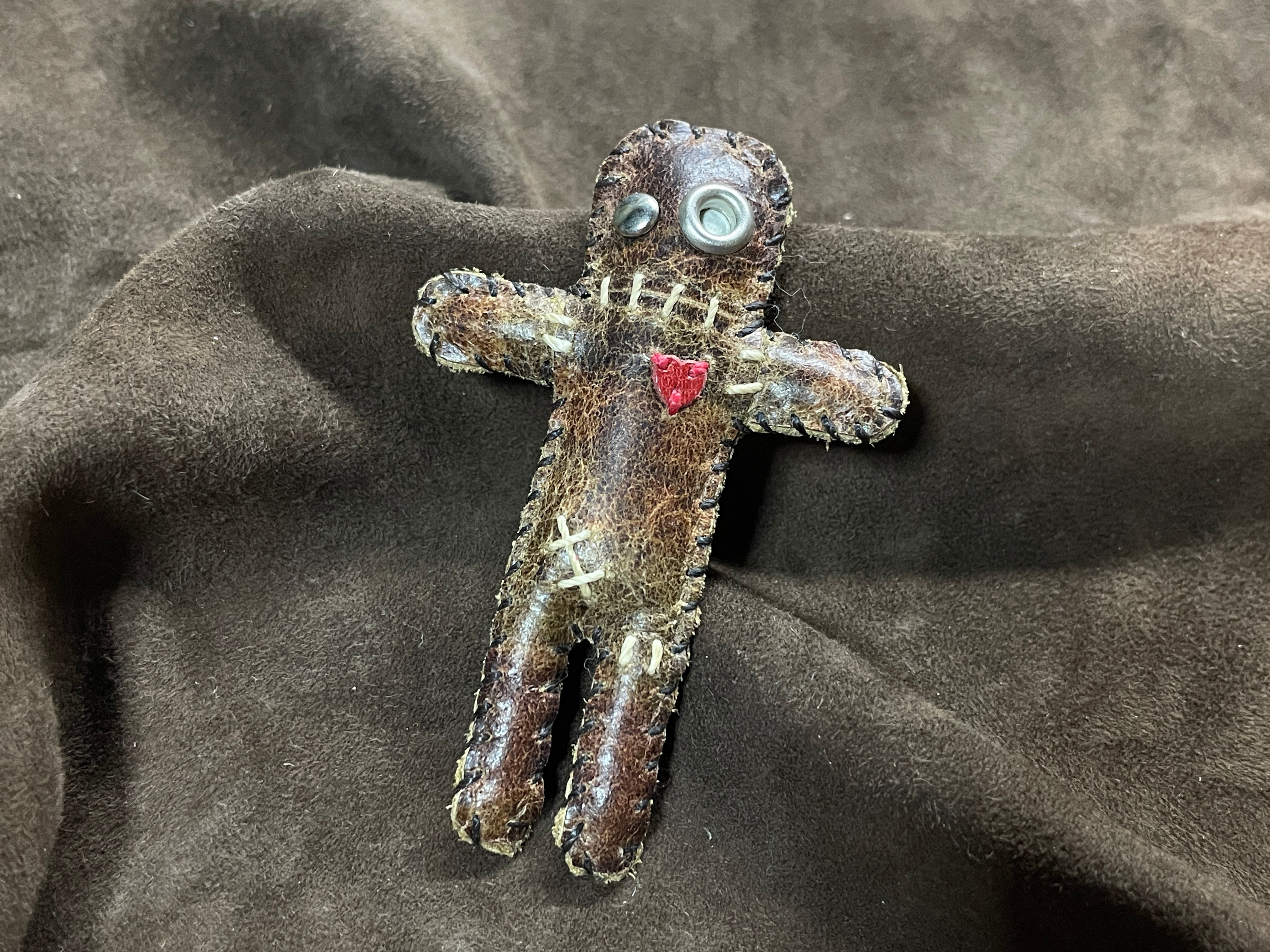 手縫いで制作している革製のミニチュアブードゥードール<呪物くん>です。