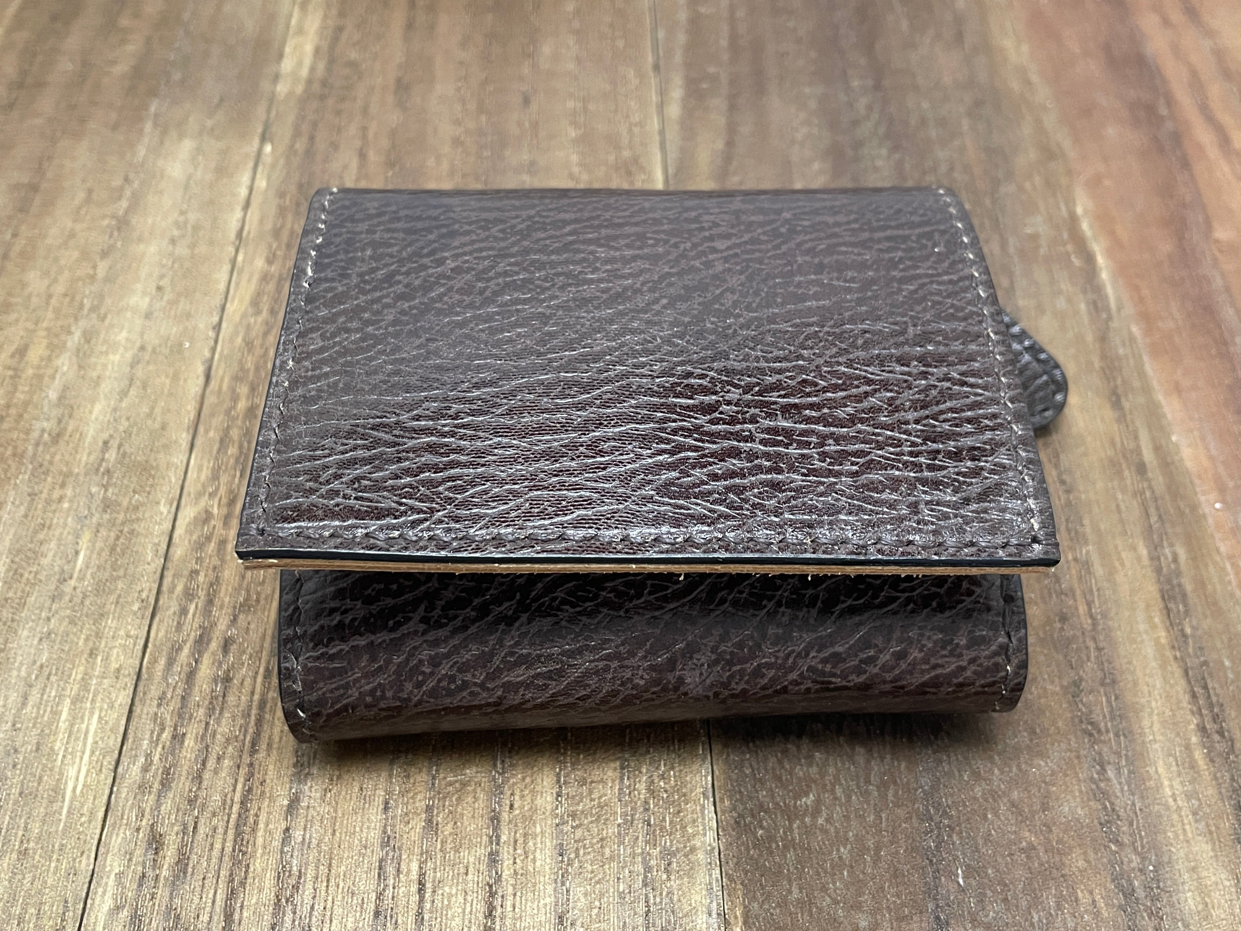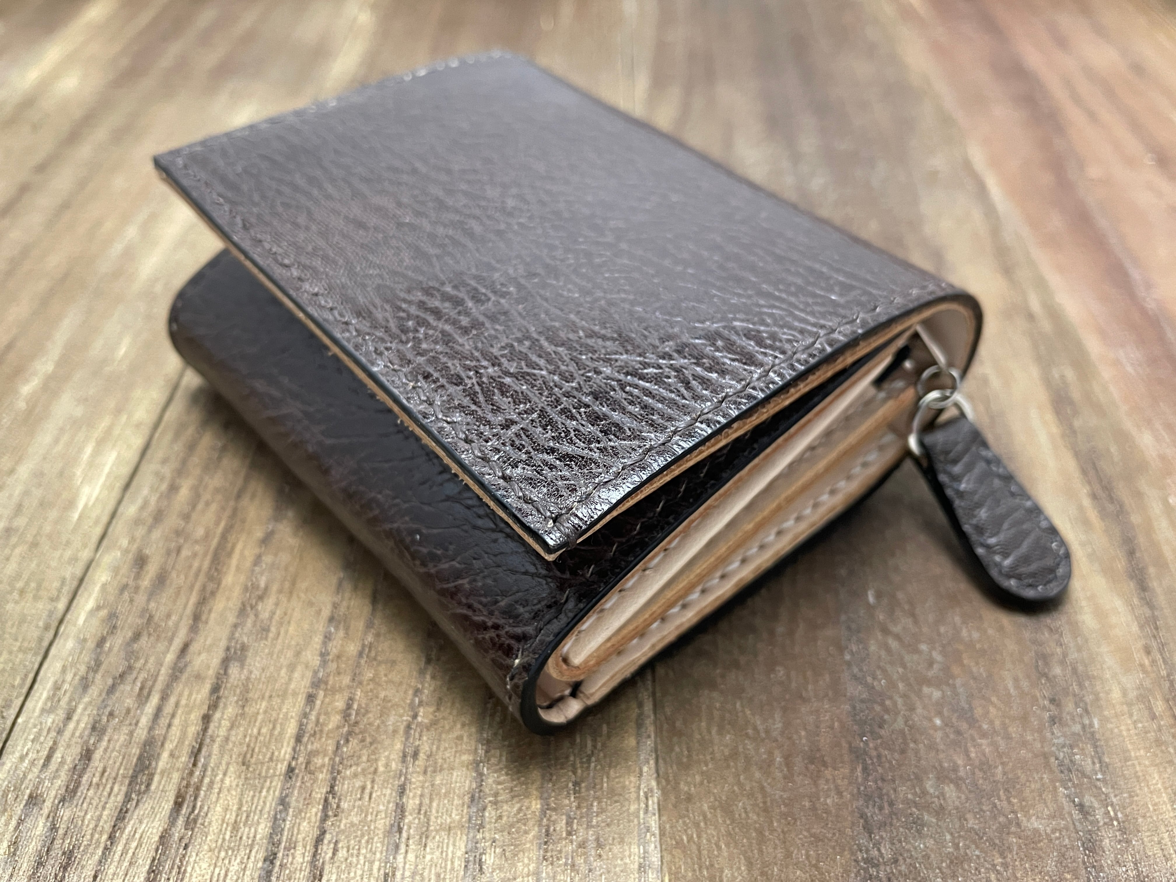 本革を使い、全て手縫いで作っているかぶせタイプのハーフサイズウォレットです。