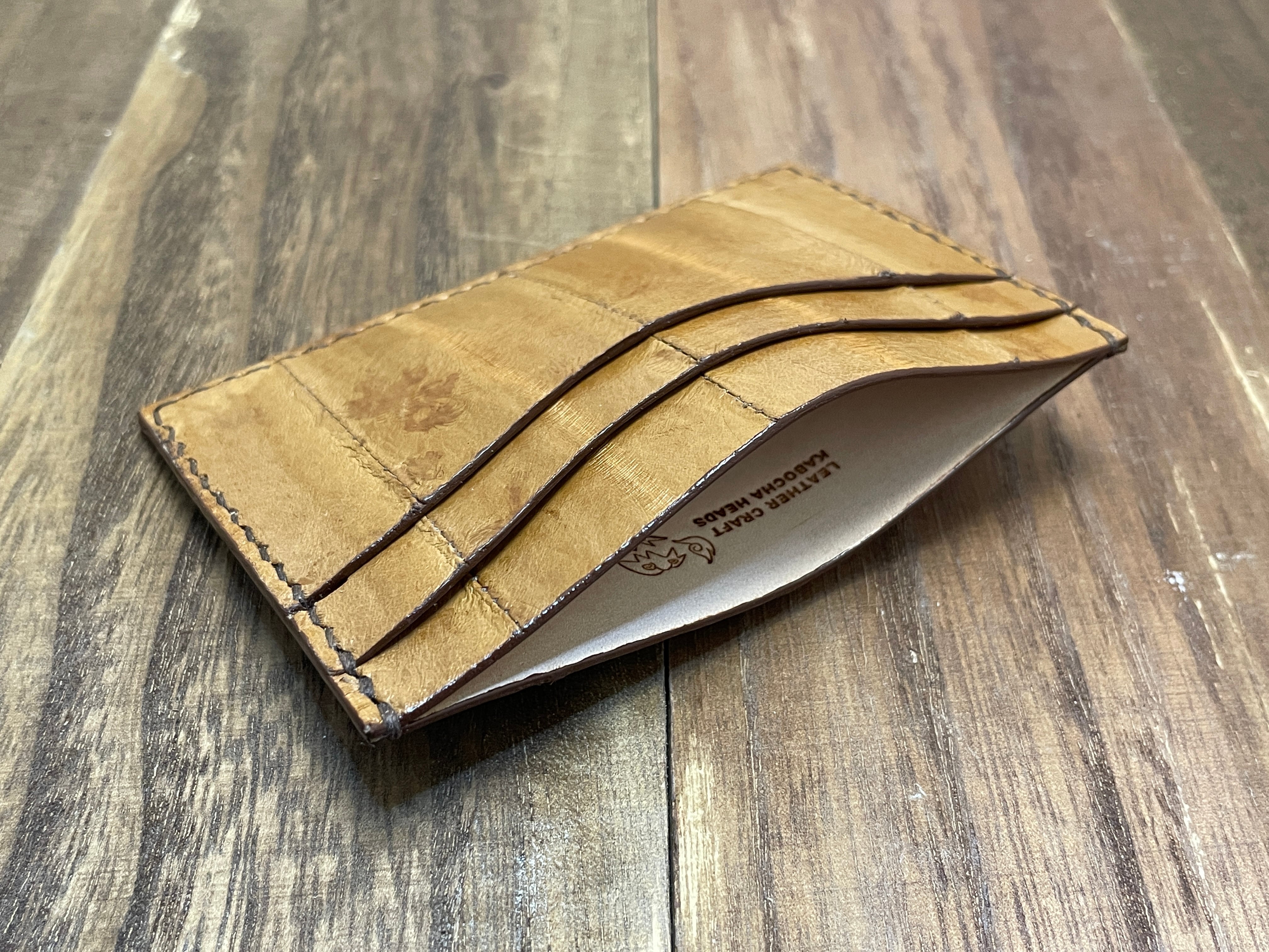 表面部分の見える場所にはキャメルのイール(ウナギ革)を使っています。
