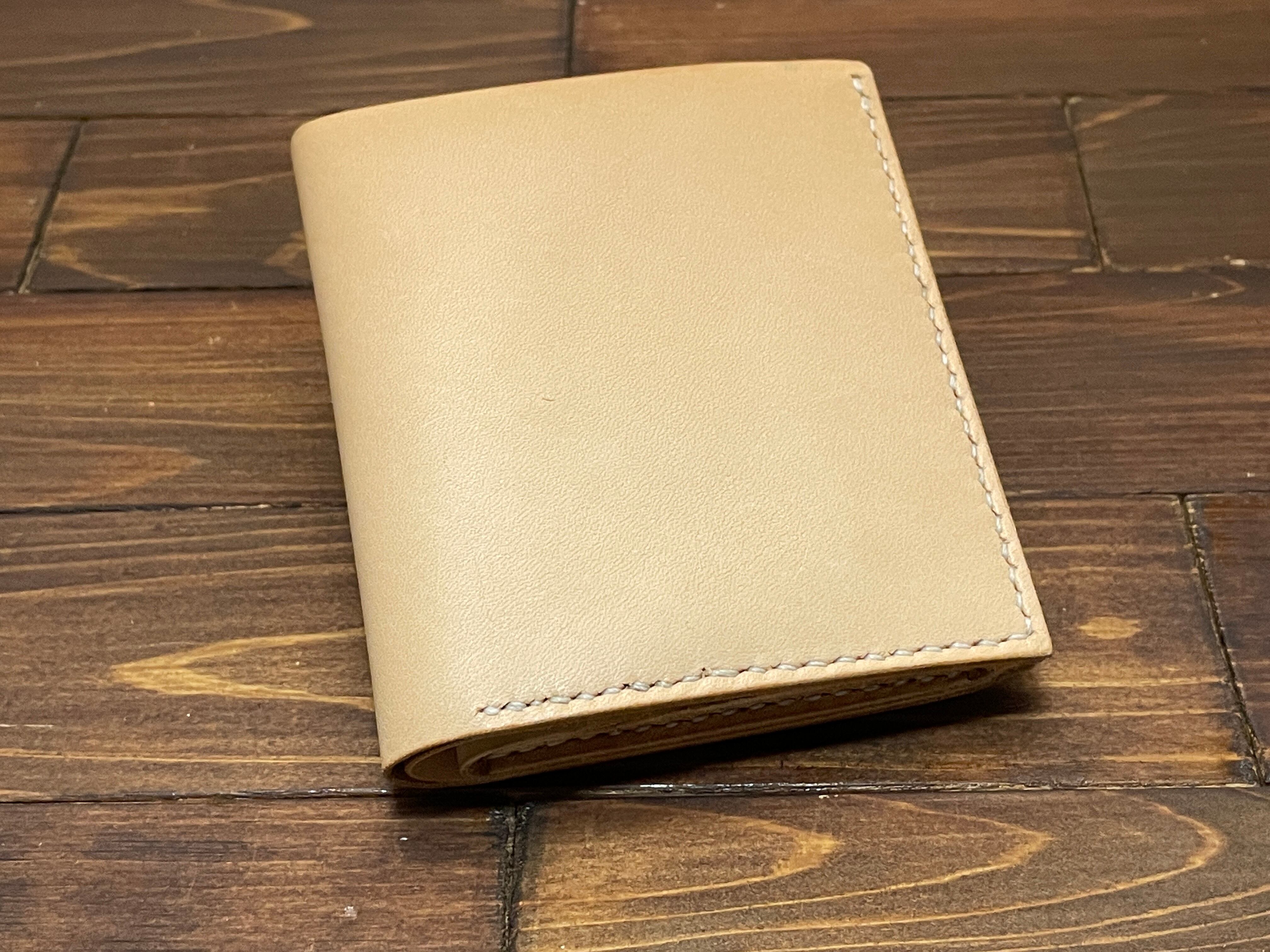 すべて手縫いで作っている二つ折りタイプのシンプルな縦型の財布です。