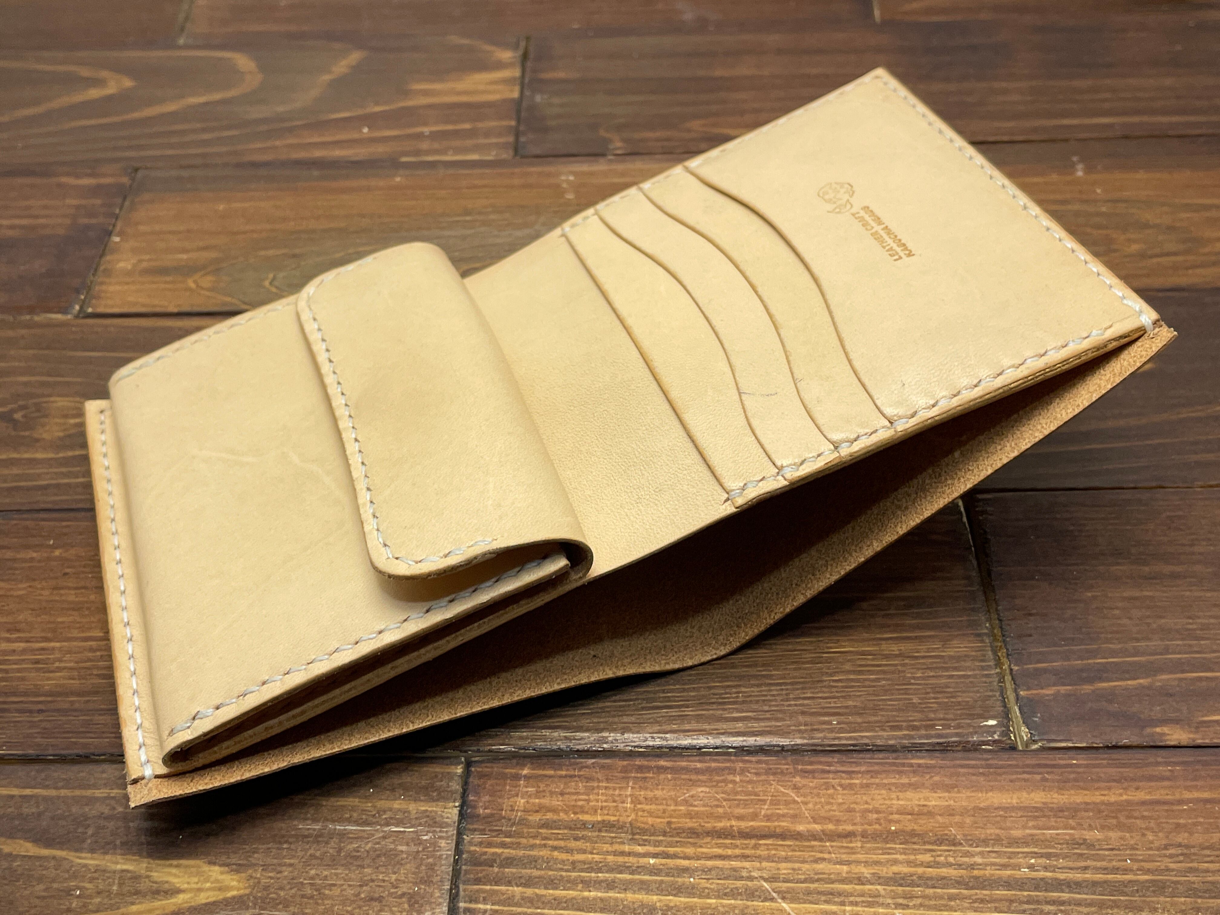 市販されている財布は小銭入れがあまり開かず使いにくいという事でオーダーが多かったため、小銭入れは広く作りにしてなっており小銭が取り出し易くなっています。