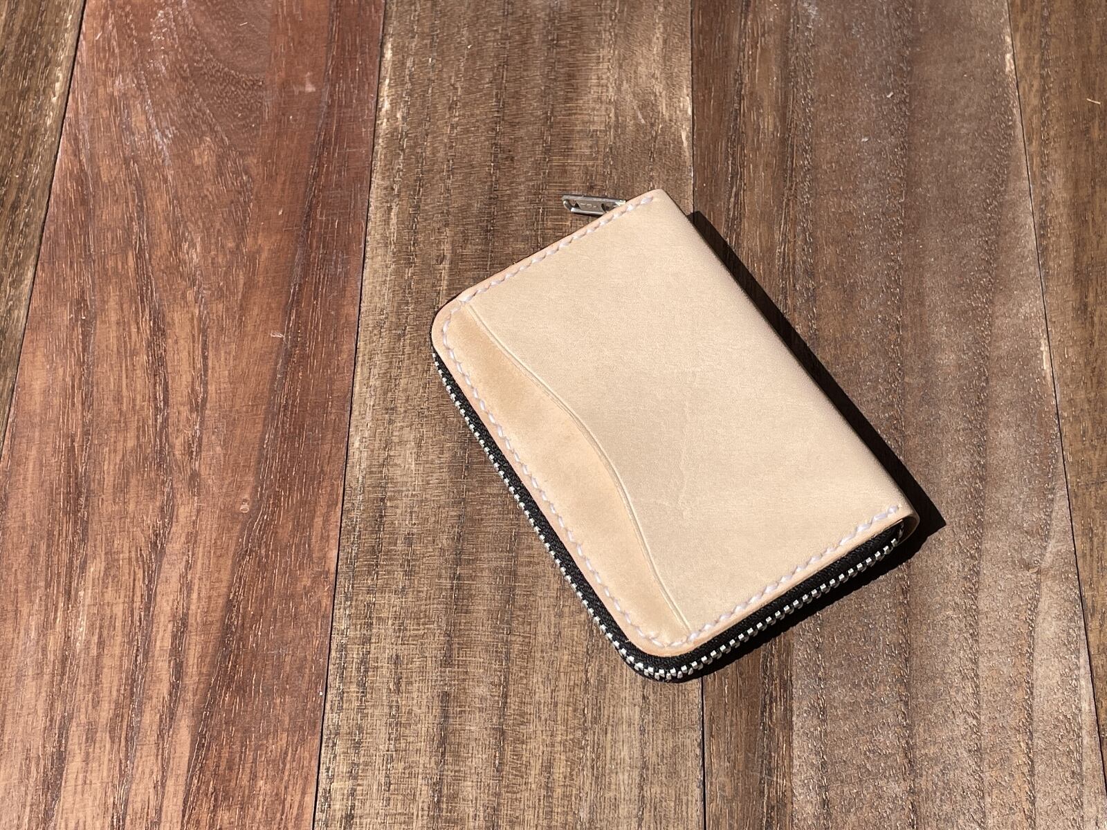 すべて手縫いで作ったラウンドファスナー型のミニ財布です。