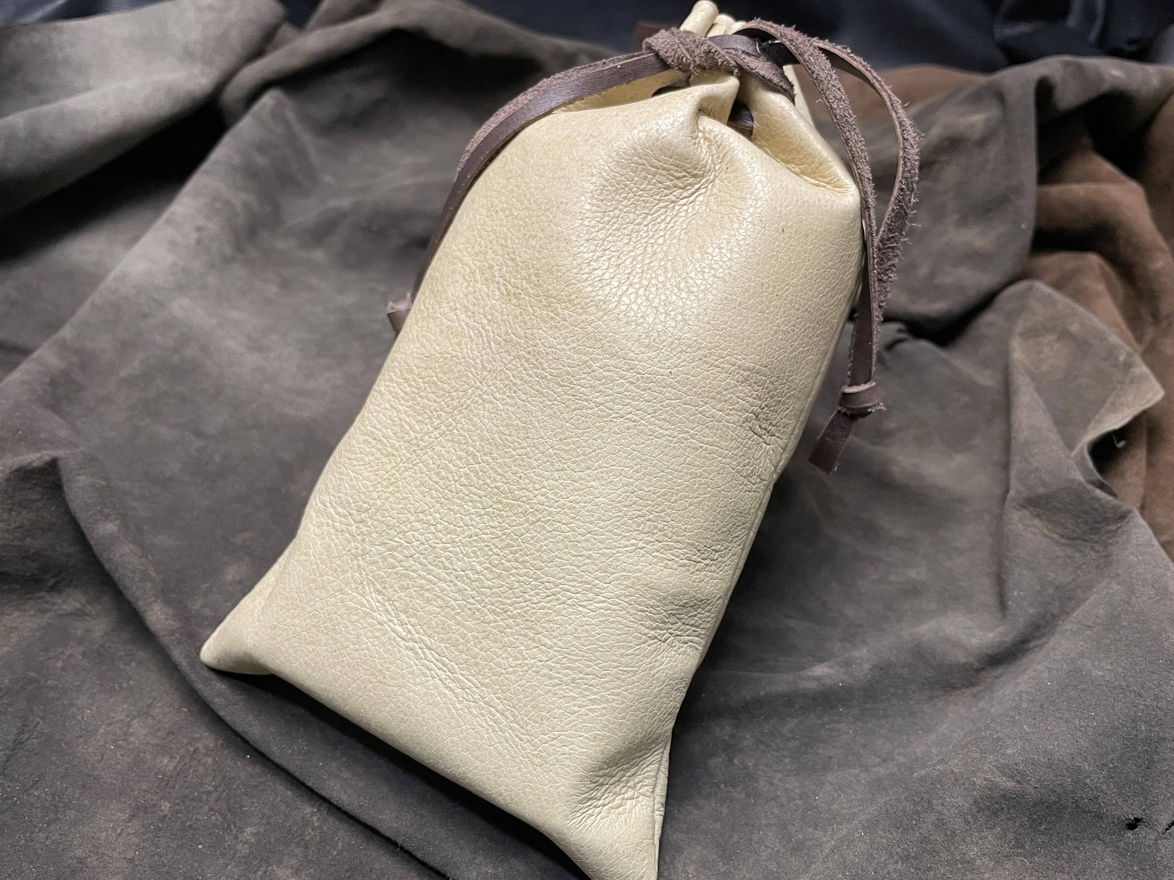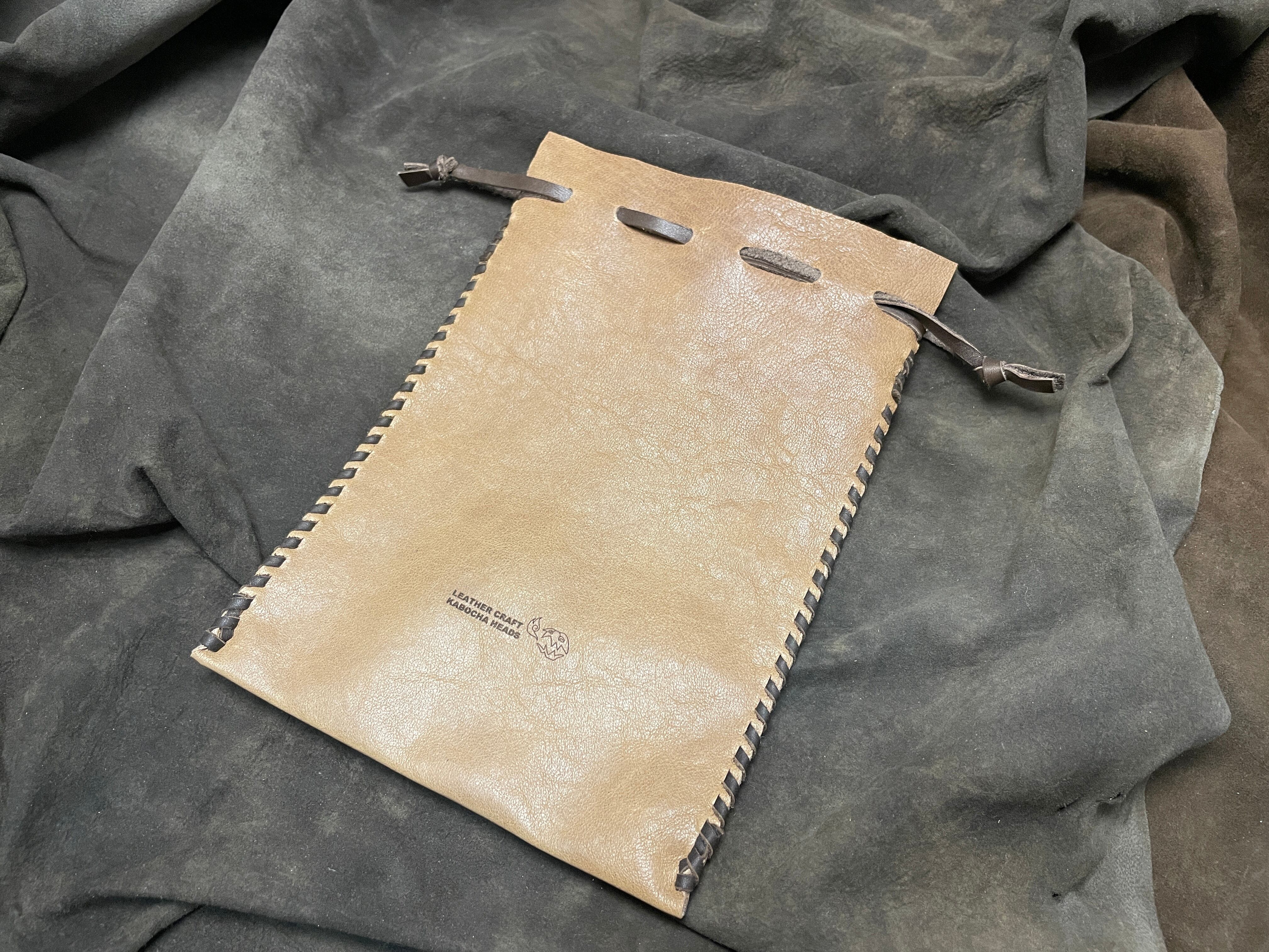 巾着の上部は開きやすいように割ってあり、滑らないように結び紐も革で作っています
